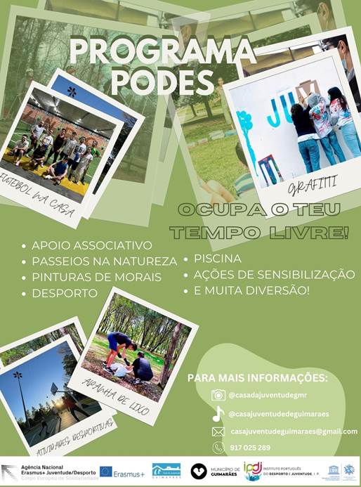 A Casa da Juventude de Guimarães lançou um Programa de Ocupação de Tempos Livres. O Programa PODES, contempla todas as medidas do IPDJ para o voluntariado, bem como os programas específicos da Casa da Juventude. Para jovens entre os 13 e os 24 anos, é um programa de base semanal que decorrerá entre julho e