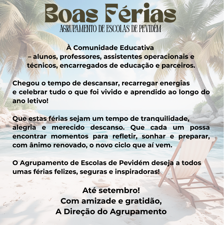 Receção aos alunos e início das atividades letivas Dia 15 de setembro de 2025 (2.ª feira) 2.º e 3.º Ciclo: 9:30 h / 10:45 h – Receção aos alunos 5.º Ano (Diretor de Turma); 9:45 h – Reunião do Diretor do Agrupamento de Escolas de Pevidém com os Encarregados de Educação dos alunos do 5º