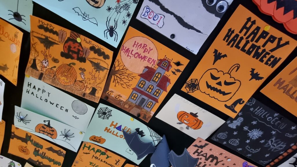 Na Biblioteca da Escola EB 2,3 realizou-se a exposição de postais em inglês, elaborados pelos alunos dos 5.º e 6.º anos, alusivos ao Halloween e acompanhados por fantásticos morcegos de cartolina, feitos pelos alunos das turmas A, B e D do 5.º ano nas disciplinas de Educação Visual e Educação Tecnológica. A comemoração do Halloween