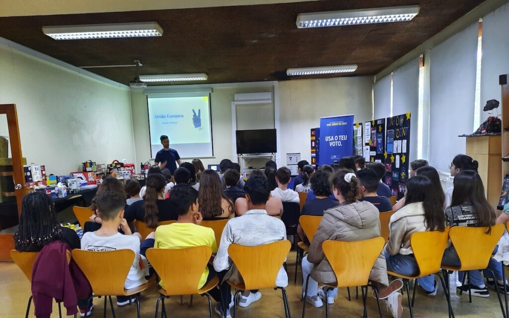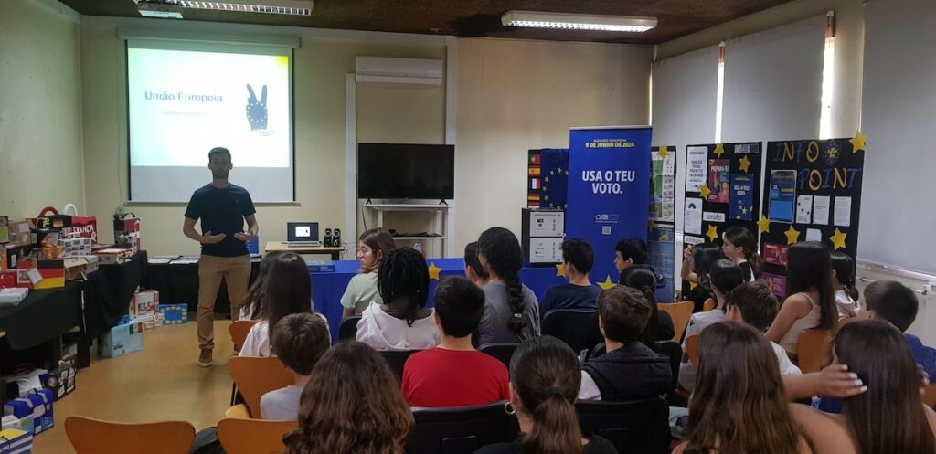 O Clube Europeu de Pevidém em articulação com o CIED Minho proporcionou, no dia 10 de maio, uma palestra, na biblioteca escolar, durante as celebrações da Semana da Europa. O evento, que teve como foco central as Eleições Europeias, contou com a participação das turmas do 7.º A e D que manifestaram bastante interesse em aprender mais sobre o processo democrático e o impacto das eleições no futuro da União Europeia.