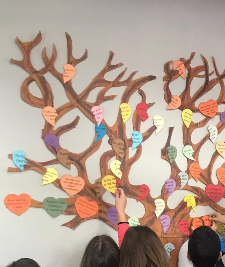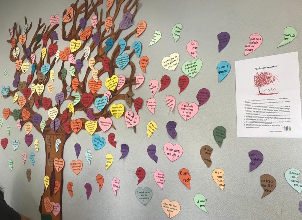 Nesta atividade, que consistiu em preencher uma árvore, colocada na sala dos alunos, com mensagens de afetividade, participaram todos os alunos e um professor de cada turma. Alguns assistentes operacionais também foram envolvidos.