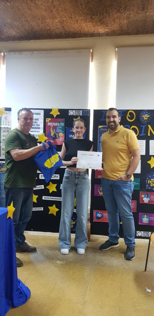 A entrega do prémio ocorreu nesta quinta-feira, dia 09 de maio, Dia da Europa, na biblioteca escolar, pelo Coordenador do Clube Europeu, Hugo Moreira, e pelo Prof. de Educação Visual, Jorge Soares.