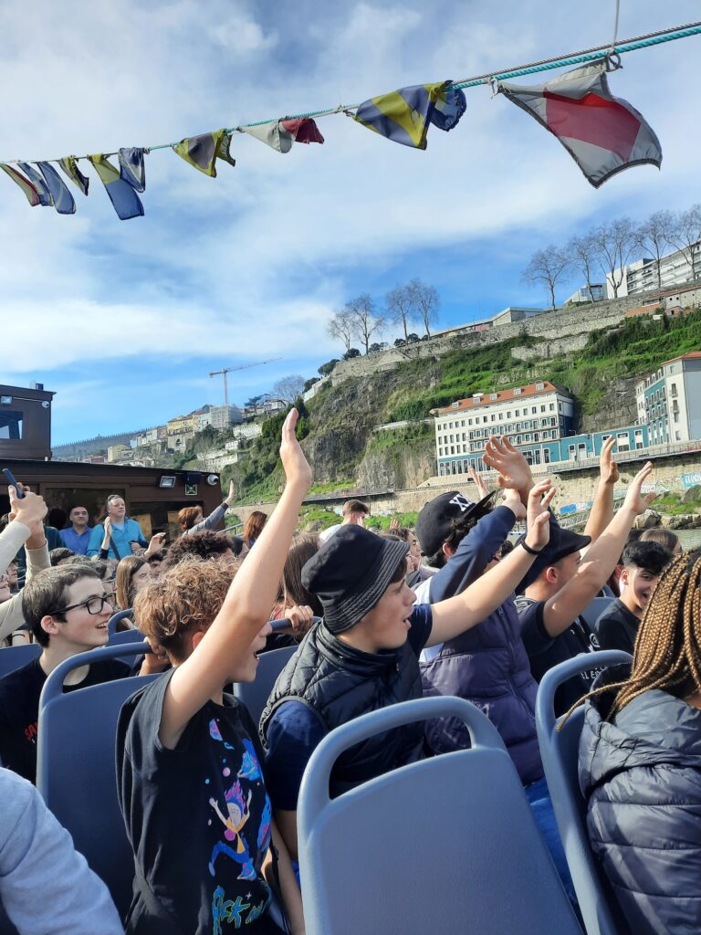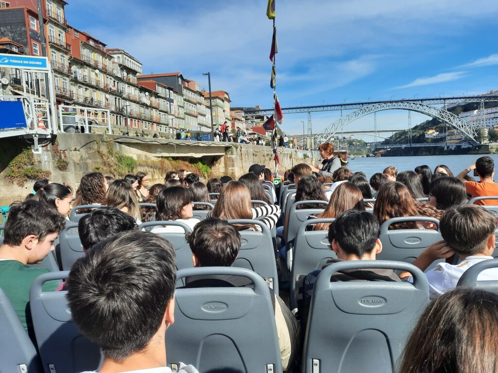Depois de uma paragem desejada e obrigatória para almoçar no centro comercial Mar Shopping, dirigiram-se à zona da Ribeira, na Cidade do Porto, onde realizaram um passeio de barco pelo Rio Douro, passeio esse intitulado o “Cruzeiro das pontes” por fazer-se precisamente entre as margens das cidades do Porto e Vila Nova de Gaia, com vista das várias pontes que as unem, nomeadamente, de Este para Oeste, as pontes do Freixo, S. João, Maria Pia, Infante D. Henrique, D. Luís I e a ponte da Arrábida. Este passeio foi presenteado com um sol esplendoroso, de agradável temperatura, onde os alunos puderam admirar, além das pontes, as fachadas e os passeios das duas cidades, os aviões a sobrevoar o rio, o teleférico na margem sul, o metro de superfície, constantemente a surgir empoleirado na ponte D. Luís I, várias aves que preambulavam por ali, ao sabor duma brisa oriunda do mar ou pela ondulação do rio, esta provocada pelos vários barcos de passeio cheio de turistas extasiados com tamanha beleza. Foi, sem sombra de dúvida, um momento muito especial, relaxante e inesquecível.
